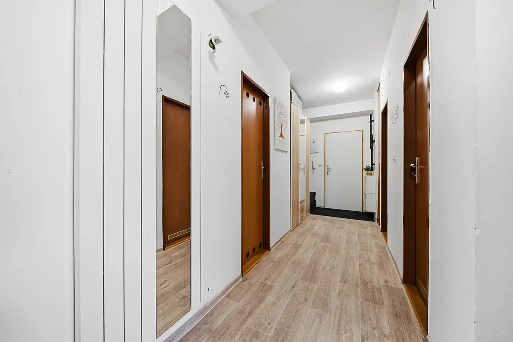 Kuchyňská linka je vybavena lednicí, myčkou, plynovou varnou deskou, digestoří a troubou. K bytu náleží sklepní kóje.