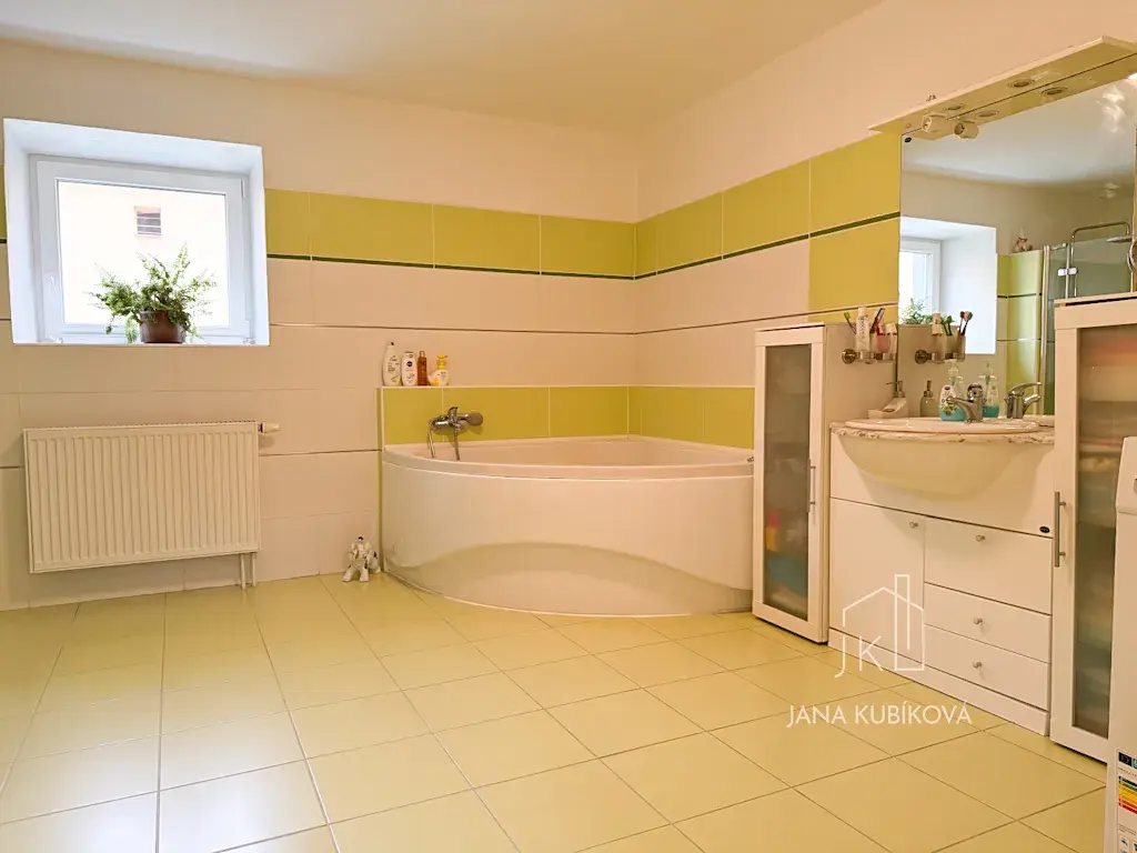 prostorná koupelna s rohovou vanou i sprchovým koutem
