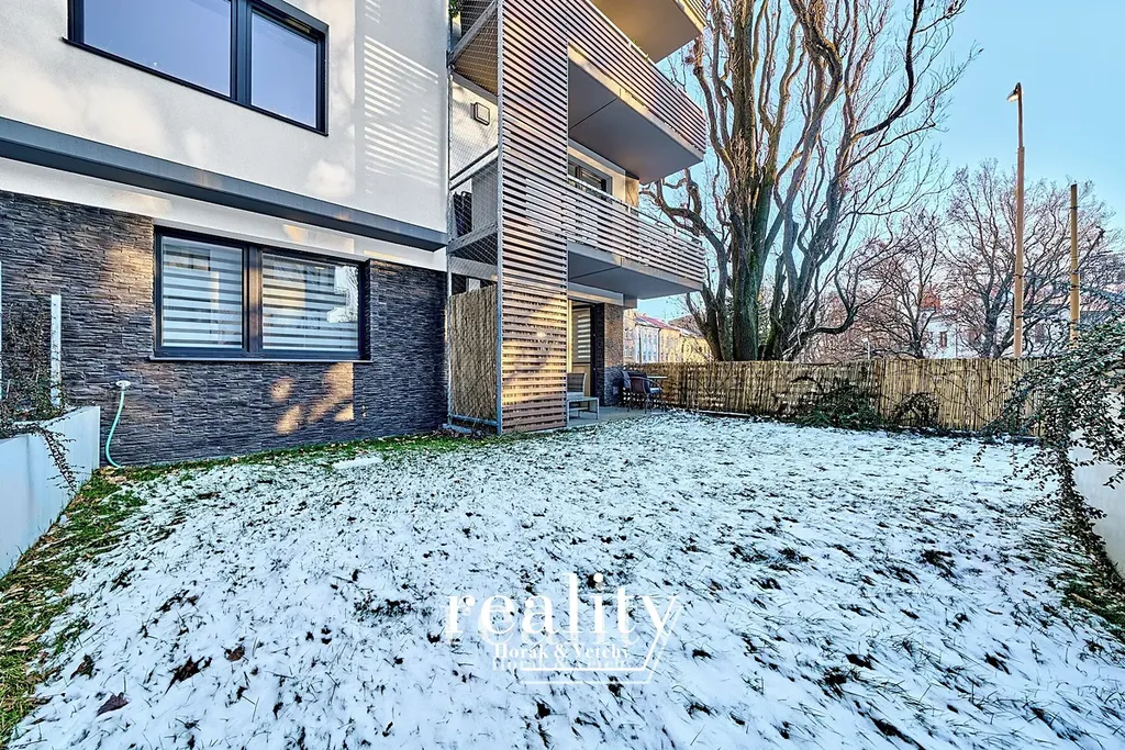 Kuchyň nabízí linku na míru včetně vestavěných elektrospotřebičů (trouba, lednička, myčka, digestoř, sklokeramická deska) a kuchyňský stůl se 4 židlemi. V obývacím pokoji je sedací souprava se stolem, na stěnách jsou dekorační prvky, ve všech oknech je instalován interní stínící systém. Z obývacího pokoje je vstup na velkou terasu se zahradním nábytkem. V dalších místnostech jsou úložné skříně nabízející dostatek prostoru a komfortu včetně manželské a jednolůžkové postele. Byt má samostatnou koupelnu a oddělené WC. Součástí nájmu je sklepní kóje ve vnitrobloku domu. K dispozici je i vnitřní garážové parkovací stání - 2 000 Kč/měsíc.