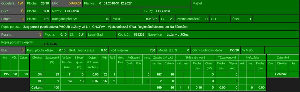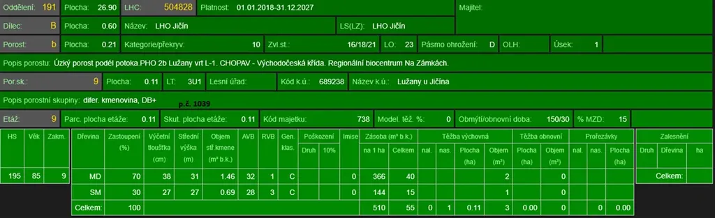 - p.č. 1039 vedená jako lesní pozemek o celkové výměře 1 002 m2 (stáří lesa 93 let - zastoupení dřevin modřín, smrk).