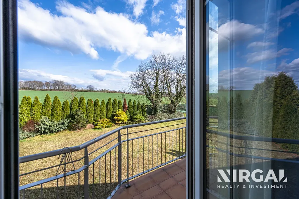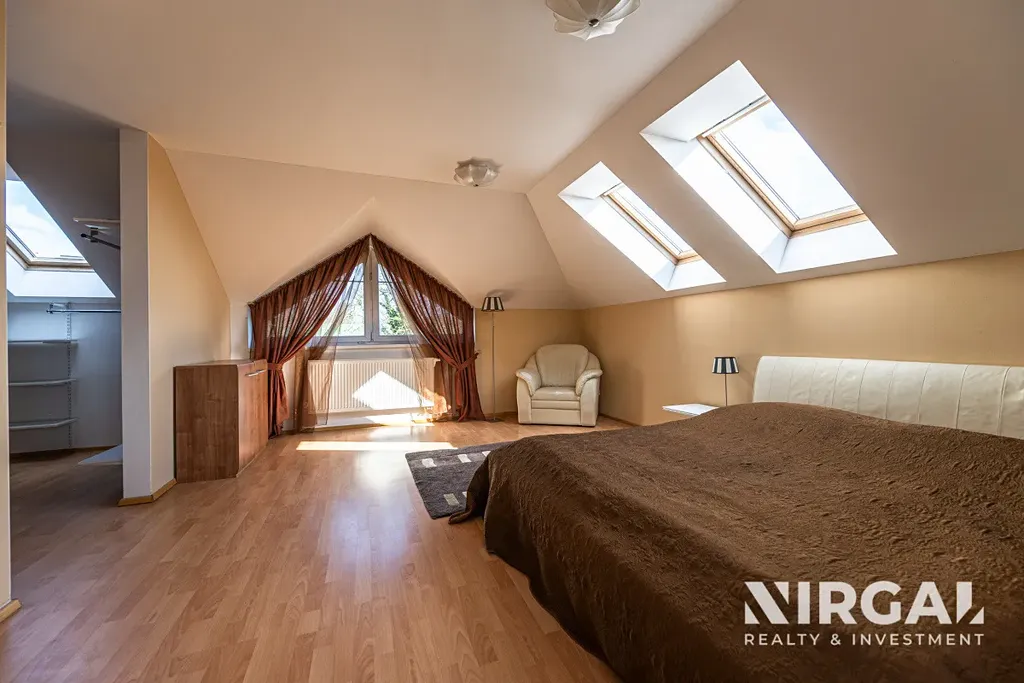V prvním patře (obytné podkroví) se nachází čtyři útulné ložnice. Hlavní ložnice disponuje vlastní koupelnou, toaletou a šatnou. Dále zde najdete prostornou koupelnu s vanou, dvěma umyvadly a toaletou. Tři ze čtyř pokojů mají přístup na balkony s nádherným výhledem do okolní krajiny.