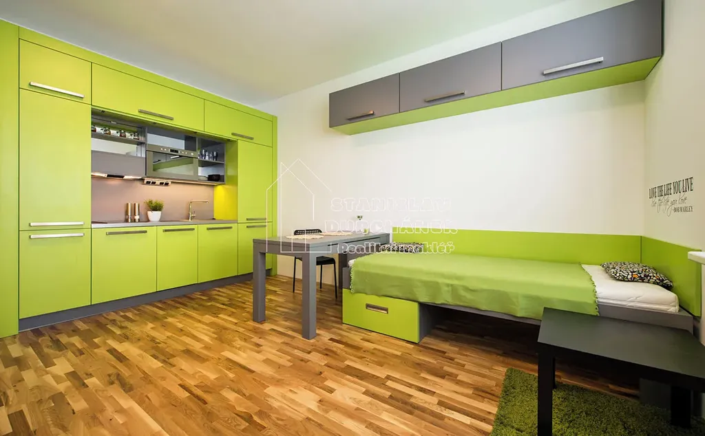 Tento neprůchozí a uzamykatelný pokoj je situován ve dvojpokojovém bytě. Každý z pokojů v bytě má vlastní kuchyňský kout s ledničkou, indukční varnou deskou, digestoří, myčkou a multifunkční troubou. Pokoj je vybavený: 2 postele, 2 stoly, úložné prostory.