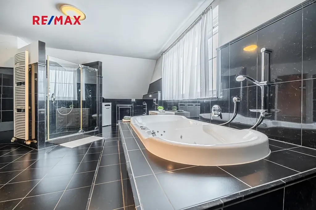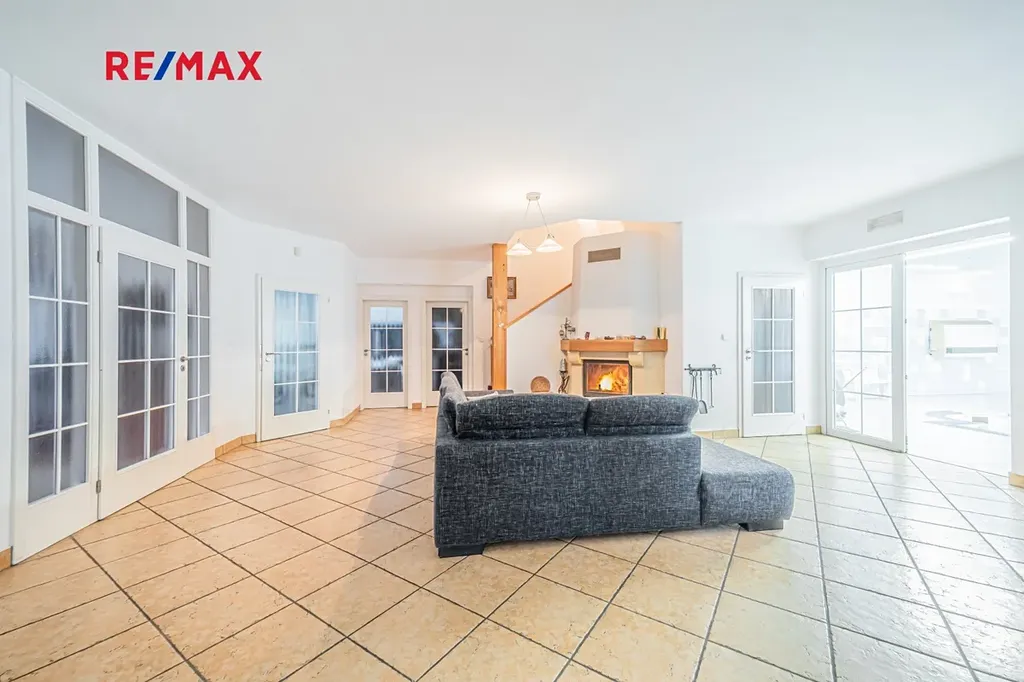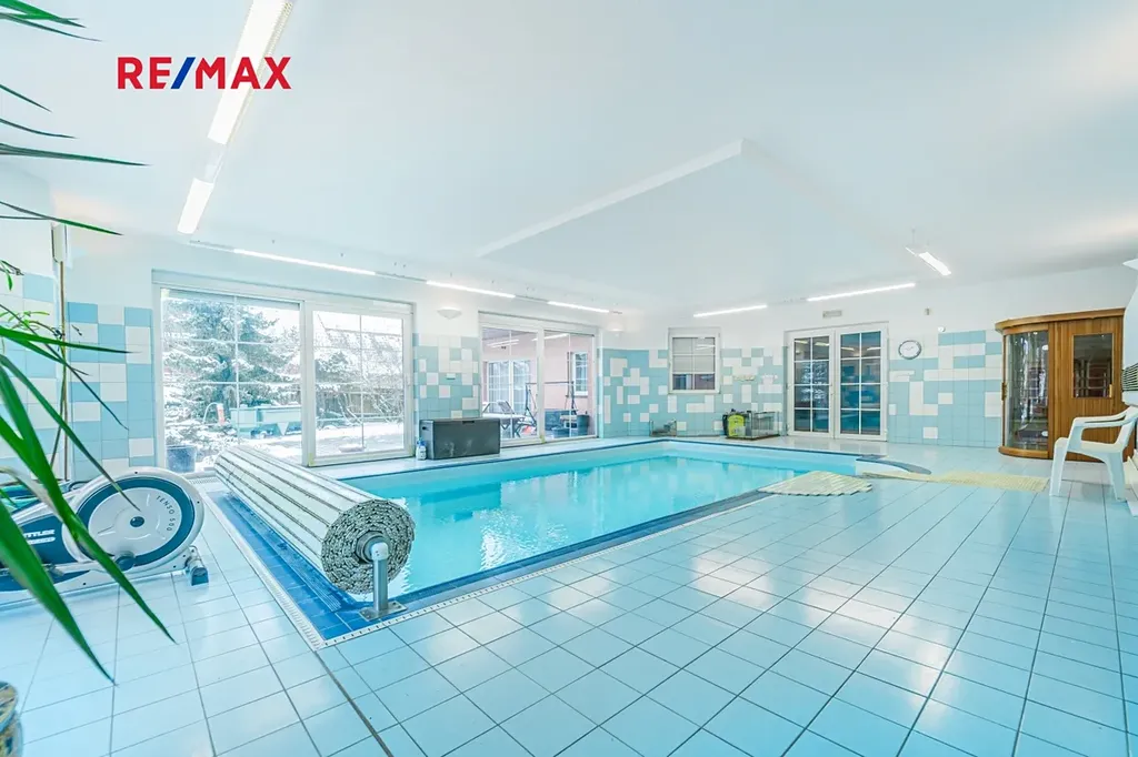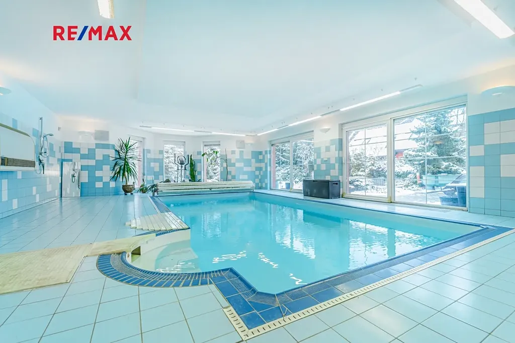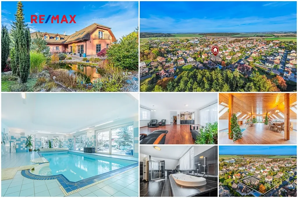 Nabízíme Vám ke koupi podsklepený rodinný dům 6+2 (774 m2) s vnitřním bazénem, garážemi až pro 6 automobilů a zahradou s okrasným jezírkem na velmi klidném místě v blízkosti lesa v obci Žilina (u Kladna).