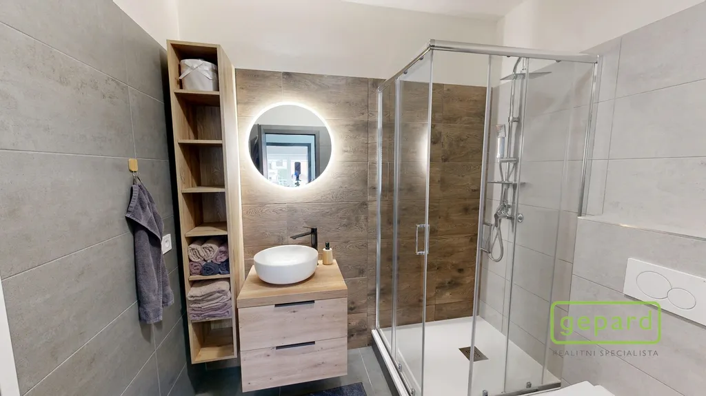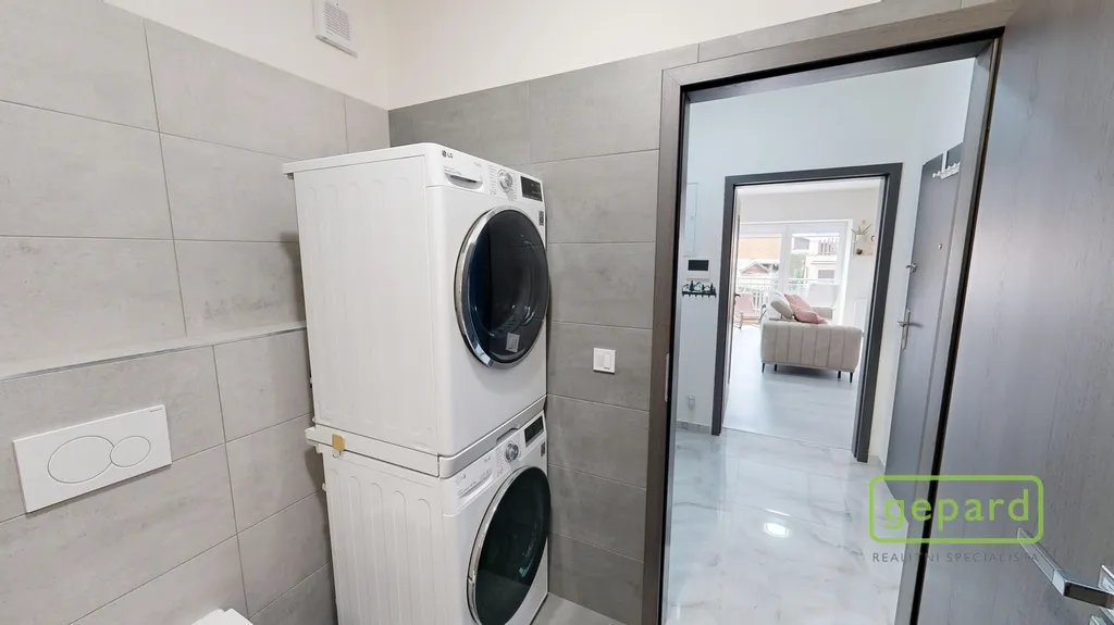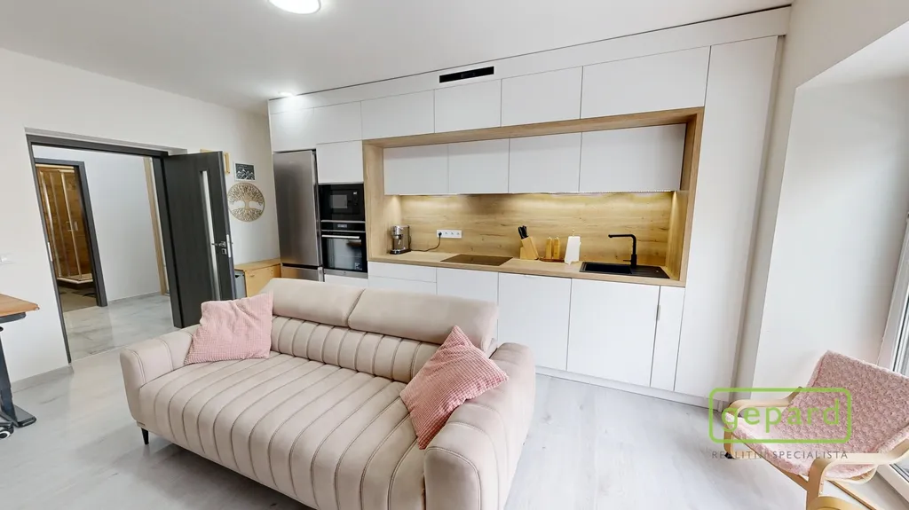 Bytová jednotka je pouhý 1 rok stará a prodává se kompletně zařízená, včetně veškerého vybavení, které je rovněž rok staré. Interiér je řešen moderně a funkčně, s důrazem na kvalitu provedení. Kuchyňská linka byla vyrobena na míru a je osazena značkovými vestavěnými spotřebiči. Vytápění je řešeno elektrickým kotlem, ohřev vody zajišťuje elektrický bojler.
