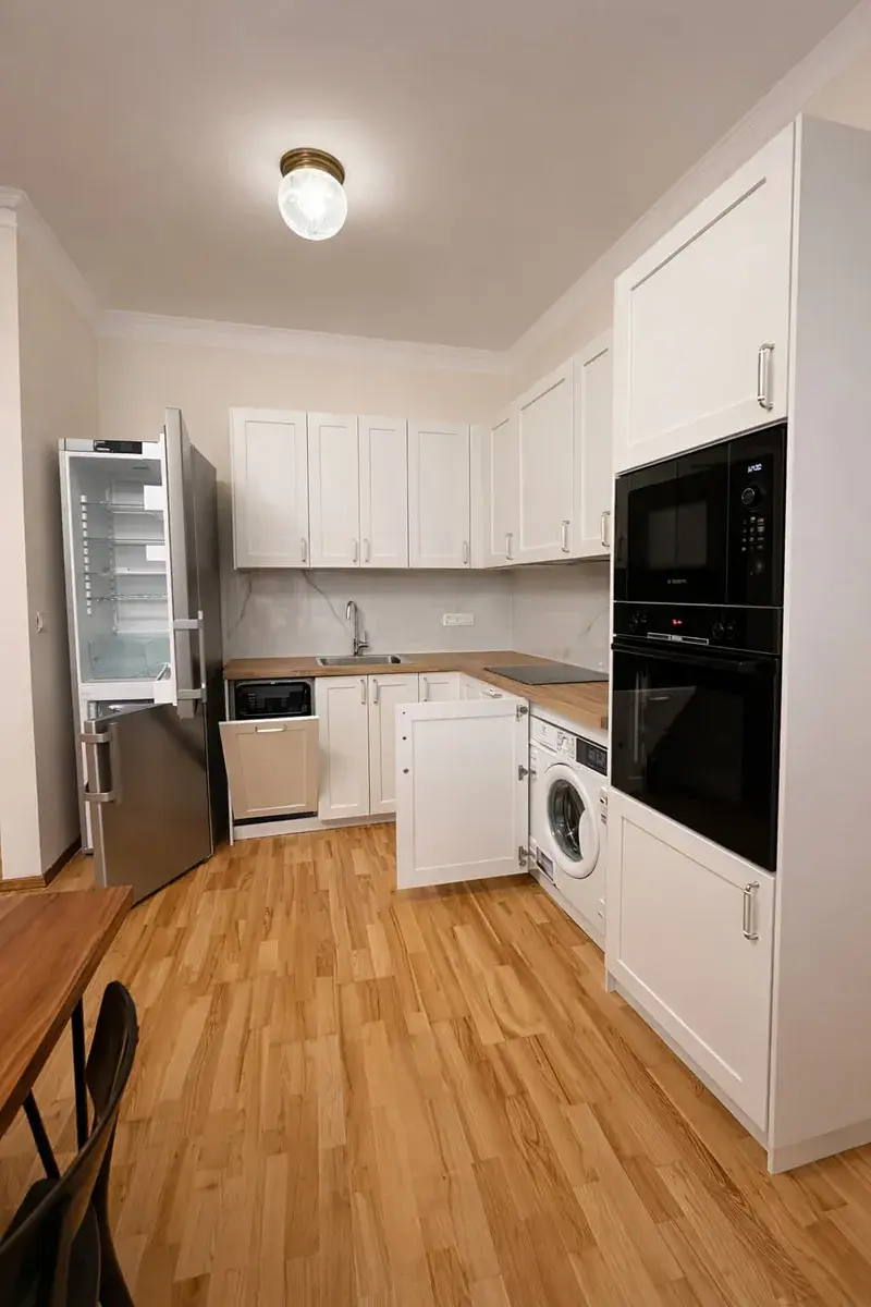 Byt disponuje ložnicí s vlastním WC, samostatnou koupelnou a prostorným obývacím pokojem s kuchyňským koutem. Kuchyň je plně vybavena spotřebiči – pračkou, lednicí, myčkou, troubou a mikrovlnnou troubou.
