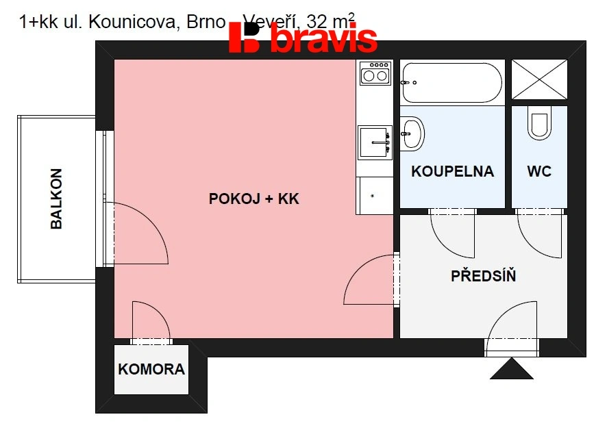 Ve výhradním zastoupení majitele nabízíme k dlouhodobému pronájmu slunný byt s balkonem o velikosti 1+kk v centru města na ul. Kounicova v blízkosti Moravského náměstí a ul. Česká.