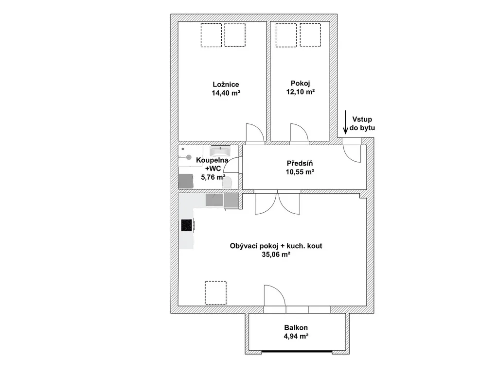 Dominantou bytu je prostorný obývací pokoj s kuchyňským koutem (35,06 m²), který nabízí pohodlné místo pro jídelní část i obývací zónu. Navazuje na balkon o velikosti 4,94 m² orientovaný do klidné části domu.