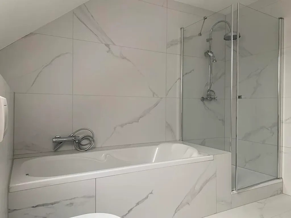2. patro. Tady se nachází celkem 3 pokoje: ložnice, pracovna a dětský pokoj. Velká koupelna s vanou, sprchovým koutem a WC.