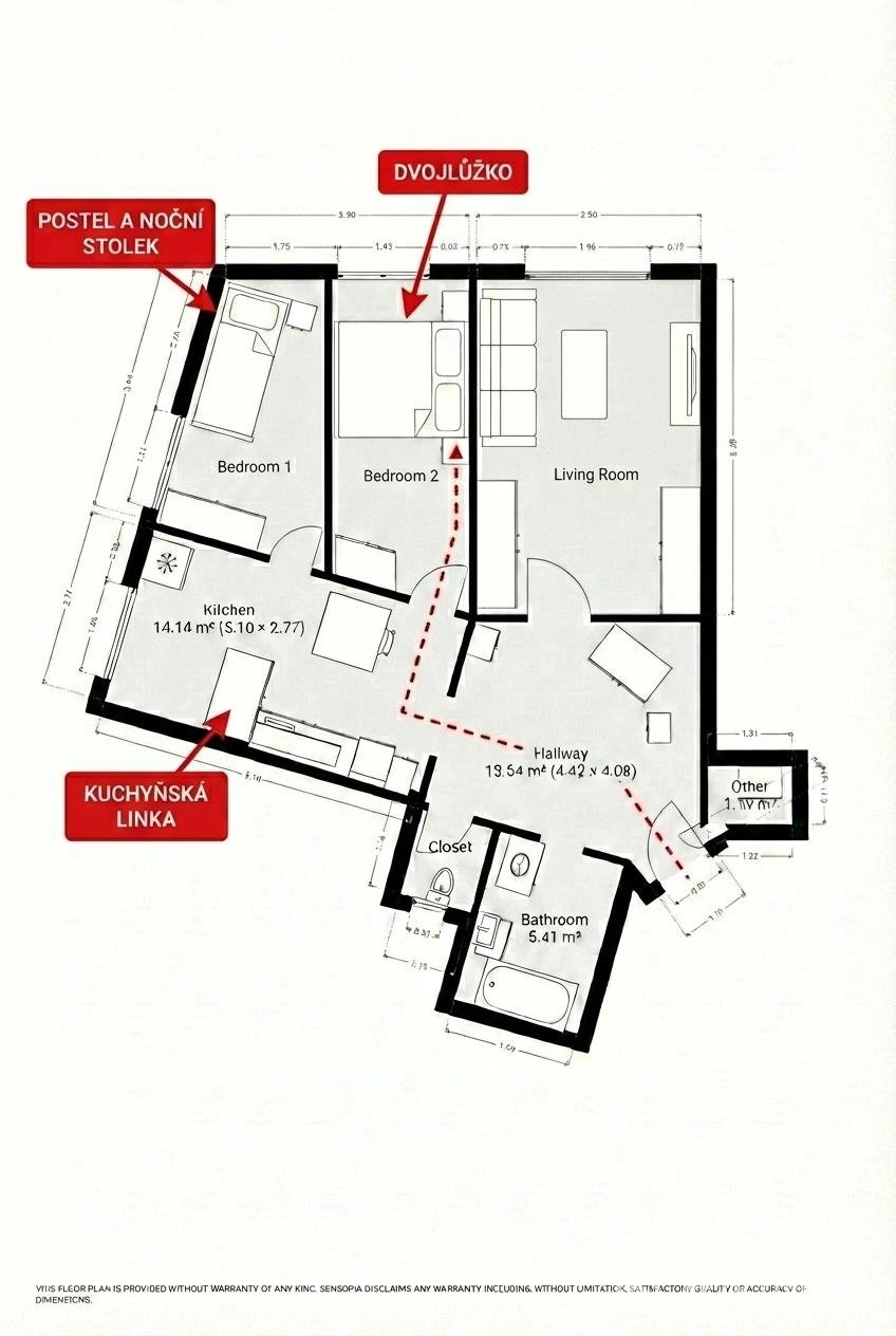 Příčka mezi ložnicí a kuchyní je nenosná – jejím odstraněním lze byt snadno rozšířit na dispozici 3+1. Stávající ložnici (19,9 m²) je navíc možné rozdělit sádrokartonovou příčkou na dvě plnohodnotné ložnice, každá s vlastním oknem. Půdorys s návrhem nového uspořádání naleznete ve fotogalerii.