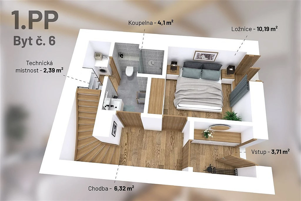 Spodní část: prostorná ložnice, koupelna a praktická technická místnost.