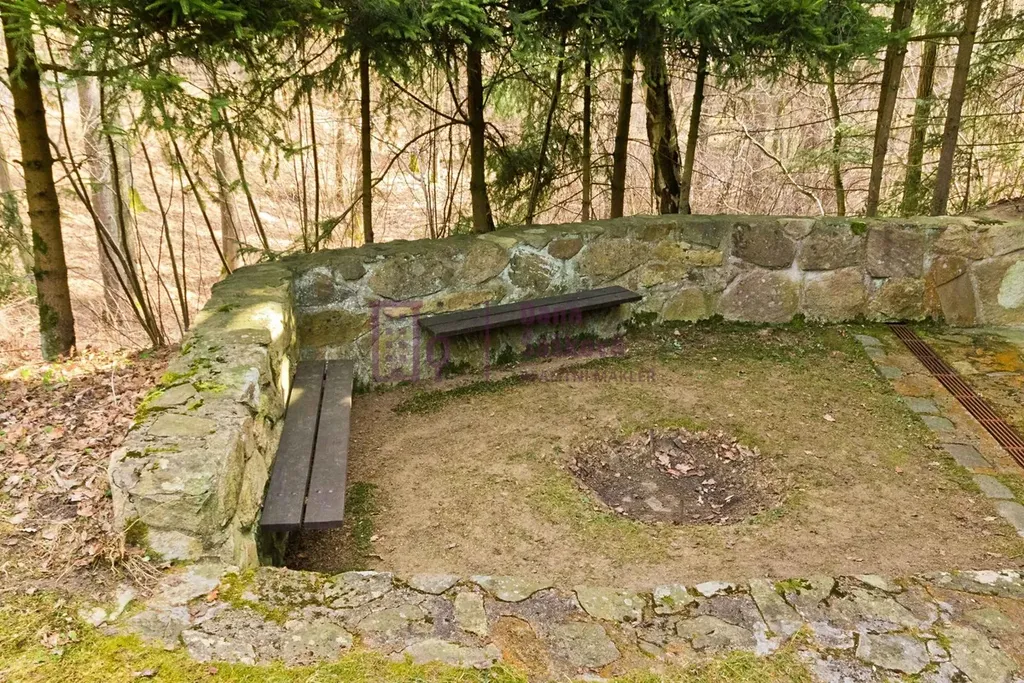 Před chatou se nachází posezení s ohništěm, pozemek je částečně obklopen živým plotem, takže poskytuje jeho uživatelům soukromí.