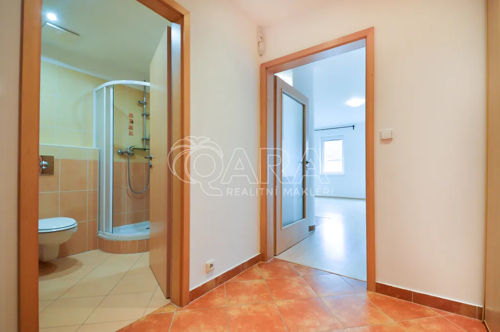 Byt nabízí prostornou předsíň s vestavěnou skříní. Ze které je vstup do pokoje s kuchyňským koutem a do koupelny se sprchovým koutem, toaletou a přípojkou na pračku. Byt je dále vybavený zabezpečovacím systémem a velkým množstvím zásuvek. Je krásně klidný a díky jižní orientaci a otevřenějšímu výhledu hezky světlý. Ve vnitrobloku celého domu je soukromá zahrada s posezením.