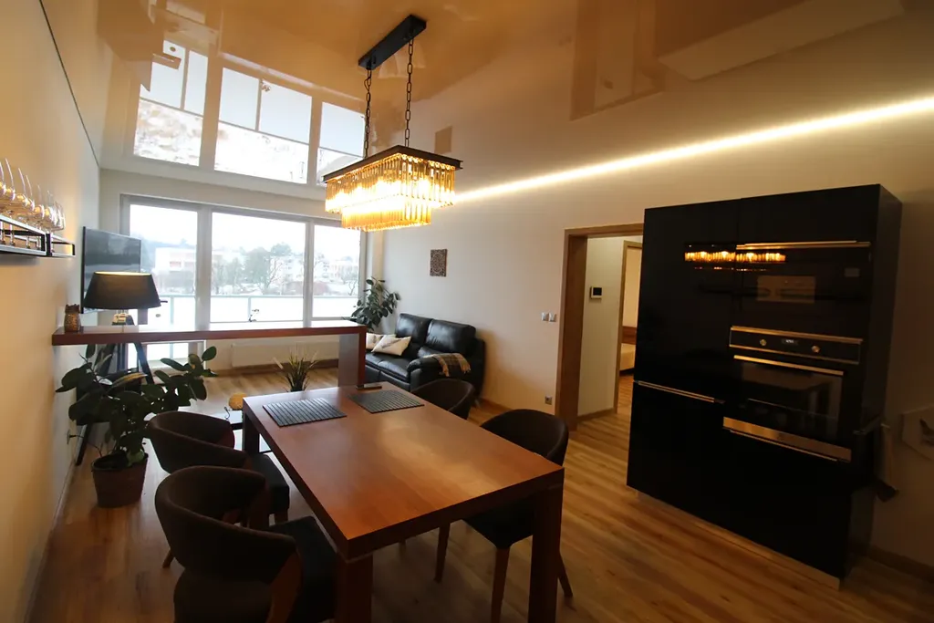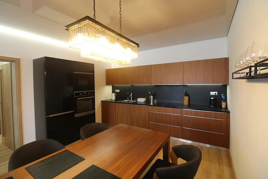 Interiér bytu je řešen v moderním designu a byt je kompletně zařízený nábytkem. Kuchyň je plně vybavena vestavěnými spotřebiči a disponuje mramorovou pracovní deskou. Veškeré vybavení, povrchy i sanita jsou zcela nové, odpovídající standardům novostavby.
