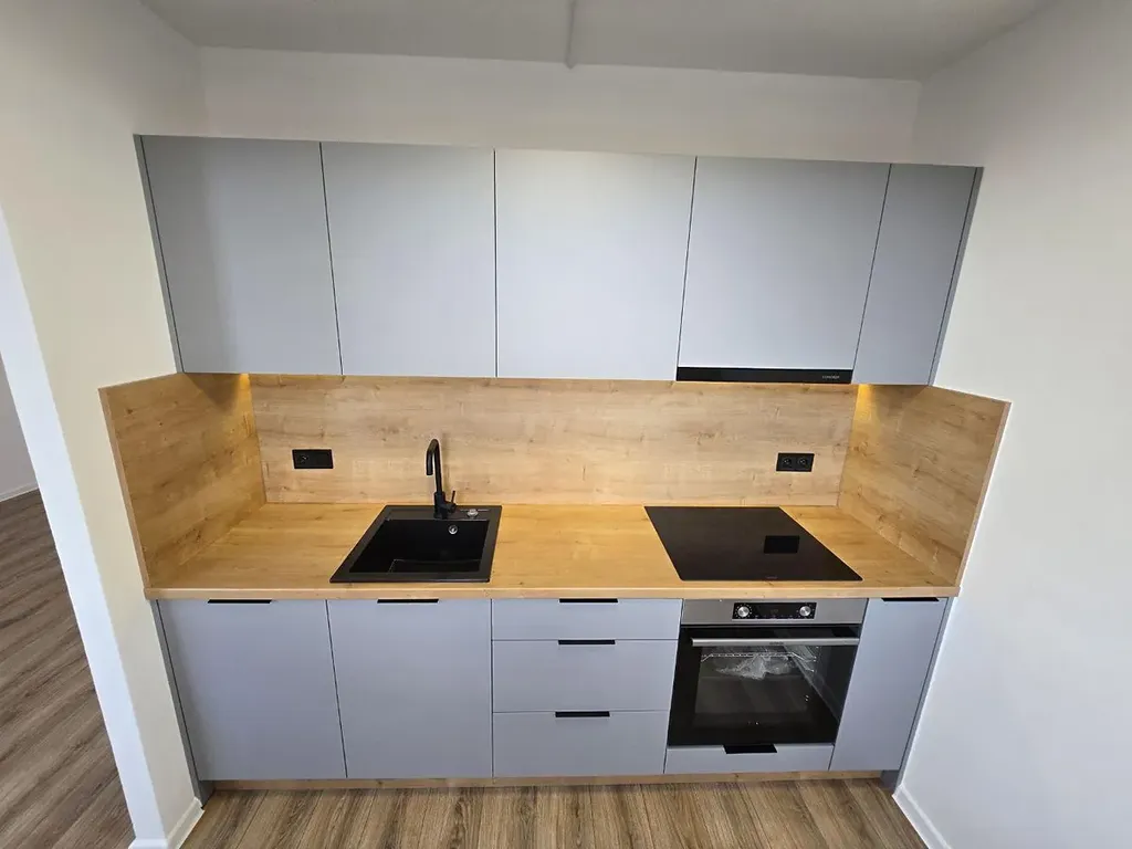 Kuchyňská linka sestavena na míru, s vestavěnou troubou. V koupelně vana s moderním umyvadlem a místem na pračku či sušičku.