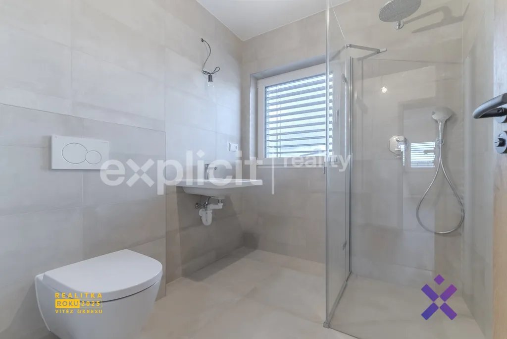 Dvě podlaží přirozeně oddělují společenskou část od klidové zóny, takže každý člen rodiny má své soukromí. Prostorný obývací pokoj navazuje na velkorysou terasu, která se stává plnohodnotným pokračováním interiéru – místem pro letní večeře, ranní kávu i večerní relax.