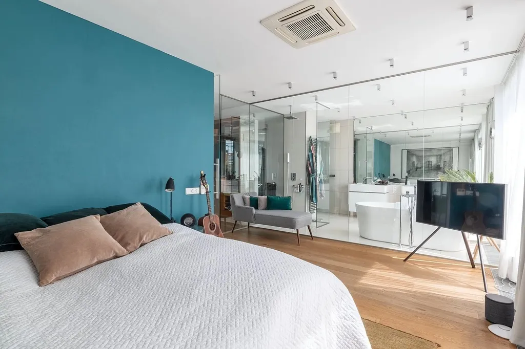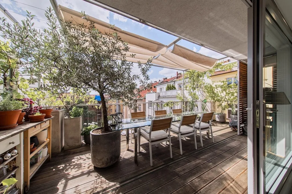 Dominantou bytu je prostorná střešní terasa s úchvatným výhledem na kostel Nejsvětějšího Srdce Páně na náměstí Jiřího z Poděbrad.