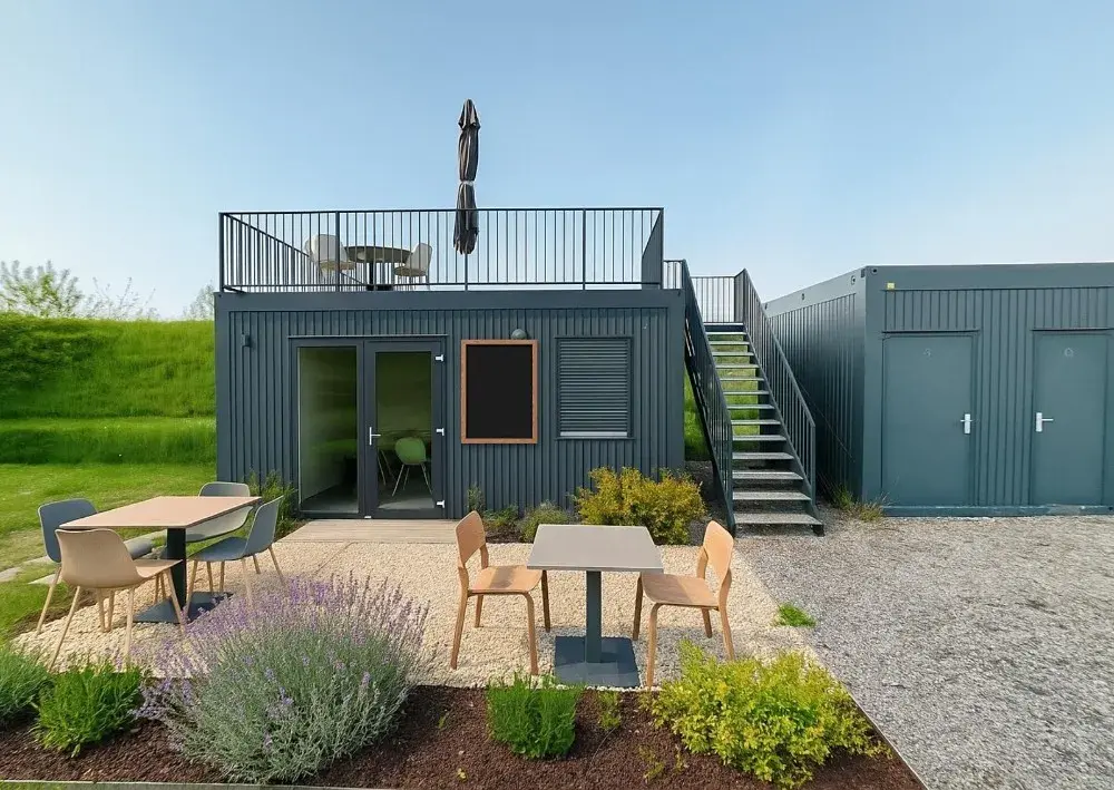 Kontejner má zpevněnou střechu, může se zde umístit posezení a slouží třeba jako terasa - viz poslední dvě fotky v inzerci s vizualizací možností využití
