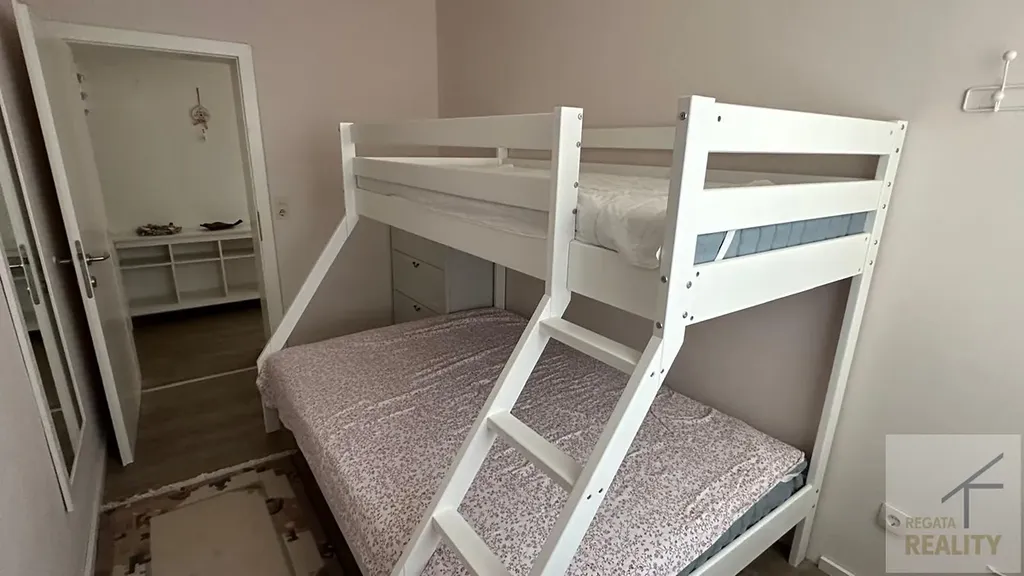 Dobře udržovaný byt se 2 ložnicemi, kuchyní s jídelním koutem, obývacím pokojem, koupelnou/WC a velkým balkonem o celkové rozloze přibližně 69,3 m², v domě pouze se 3 byty.
