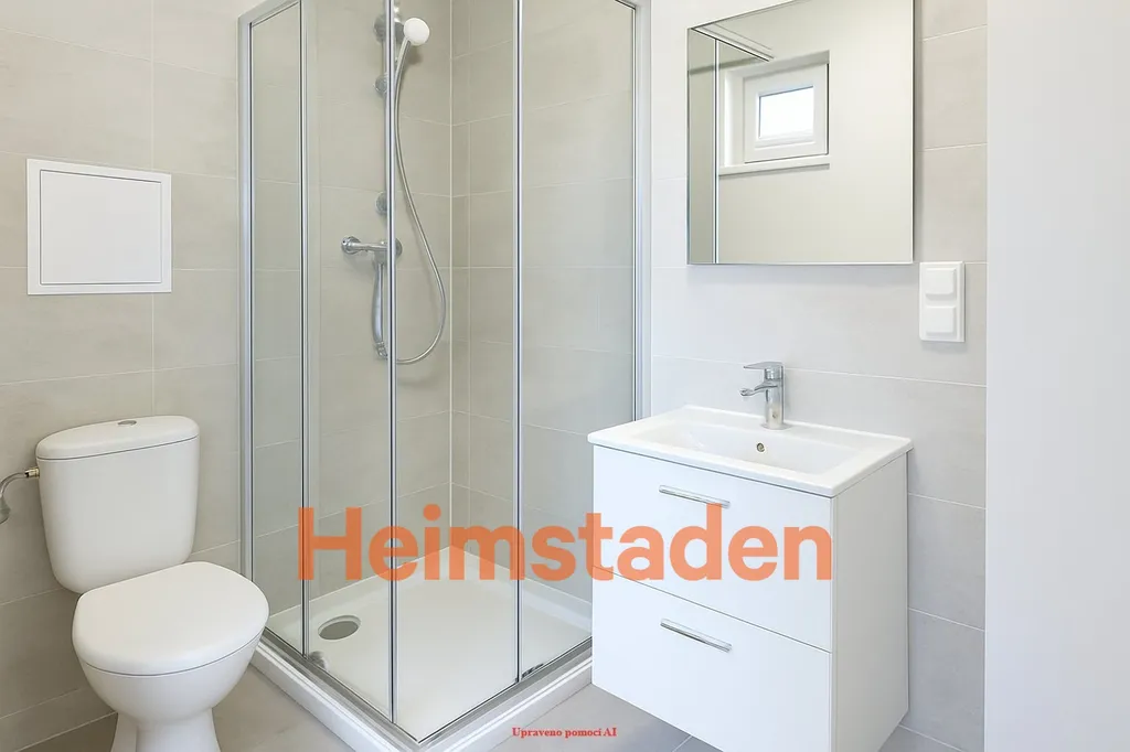 Koupelna je laděna do moderních šedých tónů, je společná s toaletou a vybavena sprchovým koutem. Velkoformátové obklady podtrhují čistý a nadčasový design prostoru.