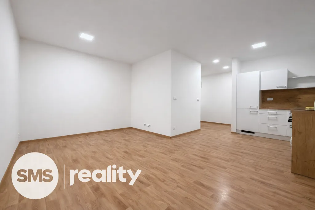 V celém bytě jsou nové plovoucí podlahy v dekoru dřeva a bílé interiérové dveře, které podtrhují moderní vzhled nemovitosti.