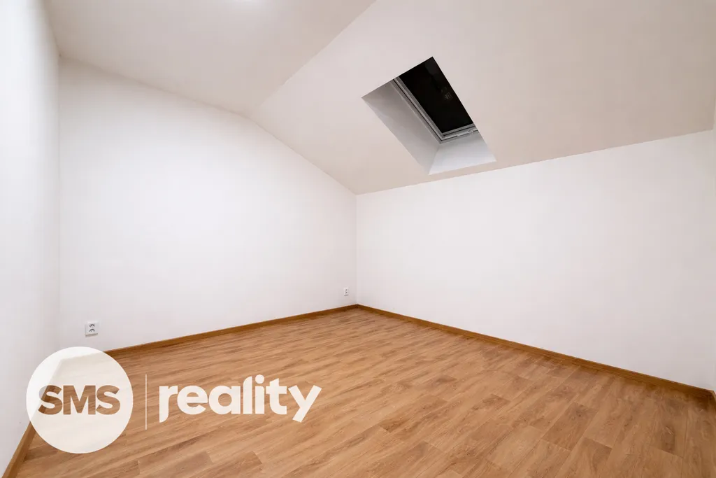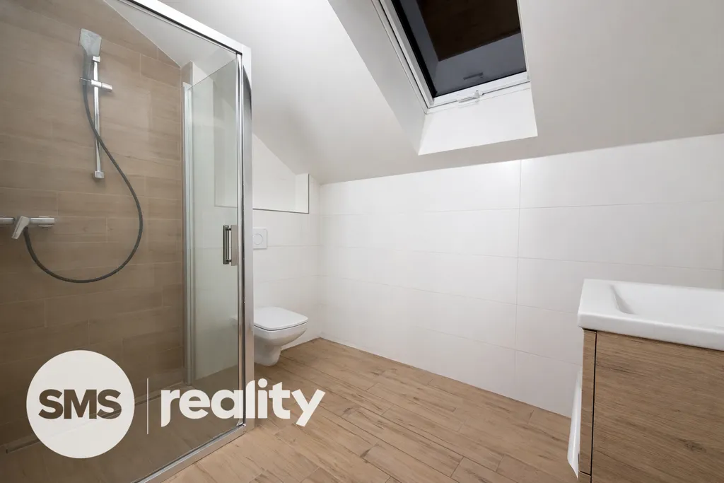 Po dřevěném schodišti se dostanete do horního patra, kde je koupelna, technická místnost a dva samostatné pokoje vhodné jako ložnice, dětský pokoj nebo pracovna. Místnosti mají příjemnou atmosféru podkroví se střešními okny, která zajišťují dostatek světla. Koupelna je vybavena sprchovým koutem, umyvadlem s koupelnovou skříňkou a toaletou.