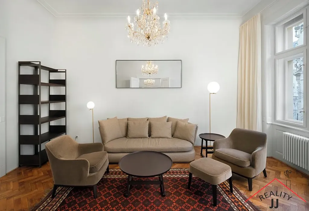 Byt se nachází ve druhém patře secesního domu s výtahem. K dispozici je vstupní hala, ze které se vchází do denní části bytu sestávající ze dvou světlých vzájemně propojených místností s půvabným arkýřem a malým balkonem s výhledem do Pařížské ulice. Interiér je vybaven sedací soupravou doplněnou několika soliterními kusy nábytku a velkoplošnou TV, kulatým jídelním stolem pro 6 osob a vkusně začleněným kuchyňským koutem.