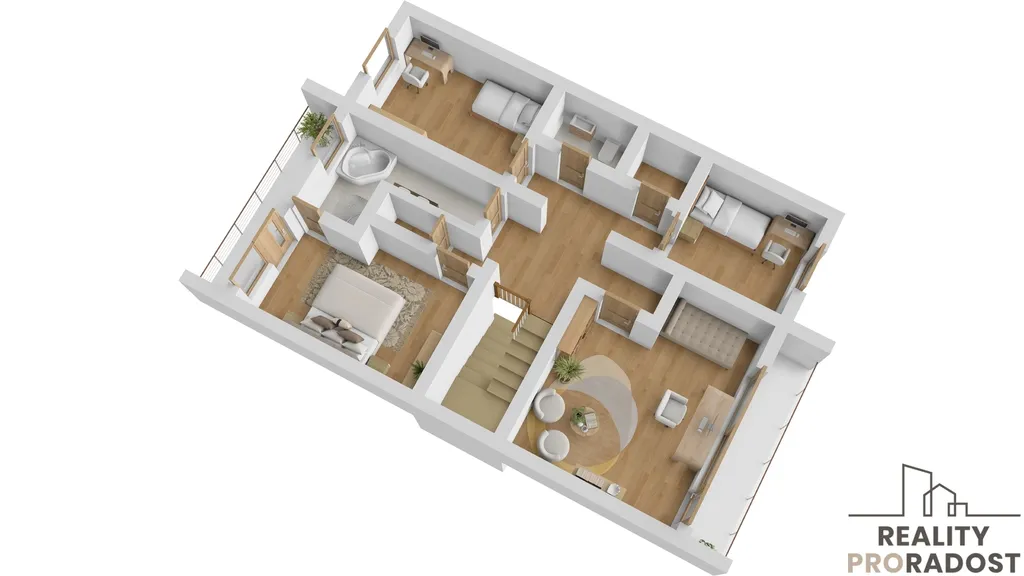 Horní patro disponuje čtyřmi pokoji, komorou, jednou menší koupelnou se sprchovým koutem a jednou velkou koupelnou s dvojumyvadlem, sprchovým koutem a rohovou vanou. Dvě větší ložnice mají vstup na balkony.