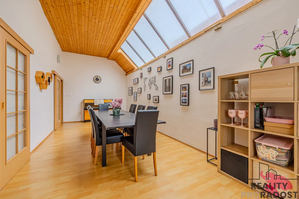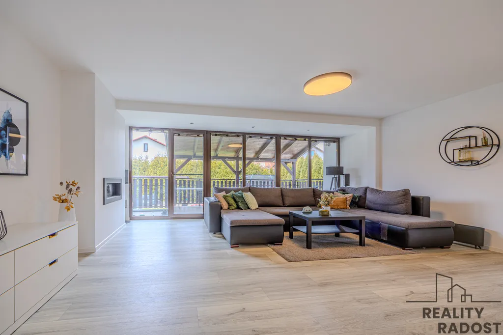 Srdcem domu je obývací pokoj propojený s terasou a zahradou – místo pro letní večery, oslavy i rodinnou pohodu. Obývací pokoj navazuje na jídelnu a ta na moderní kuchyni s indukční varnou deskou, troubou, myčkou a dalším vybavením. V přízemí nechybí ani pracovna a pokoj, který lze využít jako pokoj pro hosty nebo hernu. Koupelna se sprchovým koutem se nachází mezi dvěma pokoji, je zde i komora. Celý prostor působí útulně a propojeně.