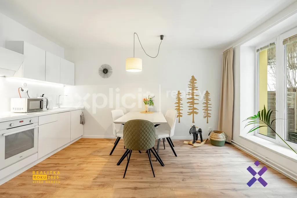 Na obývací pokoj navazuje kuchyň s jídelní částí, kde se nachází jídelní stůl se čtyřmi židlemi. Kuchyň je plně vybavená – k dispozici je volně stojící lednice, varná deska, vestavná trouba, digestoř, kávovar, mikrovlnná trouba i rychlovarná konvice.