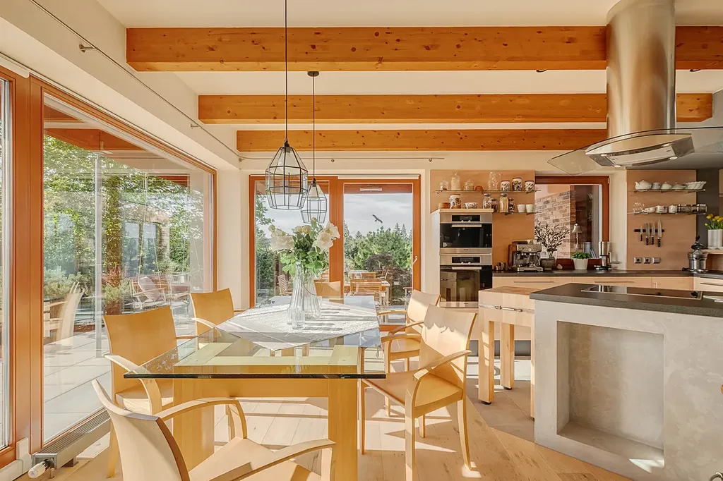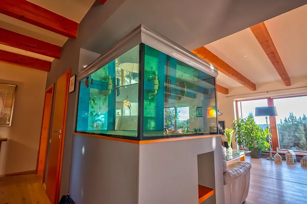 Srdcem domu je veliký obývací pokoj spojený s jídelním a kuchyňským koutem. Dostatek světla zajišťují velkoformátová okna směřující na jihozápad, poskytují uklidňující pohled do překrásné zahrady i ničím nerušený výhled v úhlu 180 ° na brdské lesy. Pocit prostoru a vzdušnosti dodávají také některé prosklené dveře. Součástí obývacího pokoje je velké akvárium. I když jste uvnitř domu, cítíte se spojeni se zahradou a okolní, krásnou přírodou.