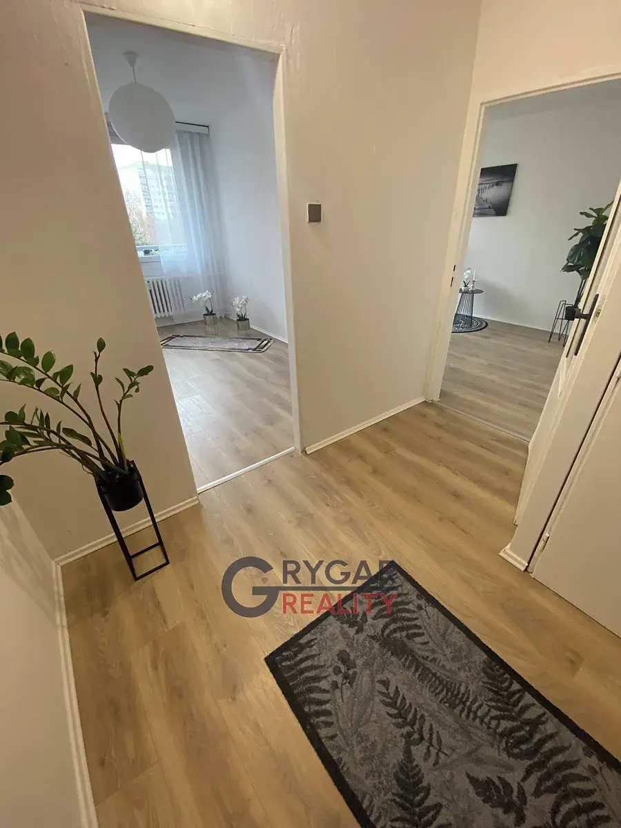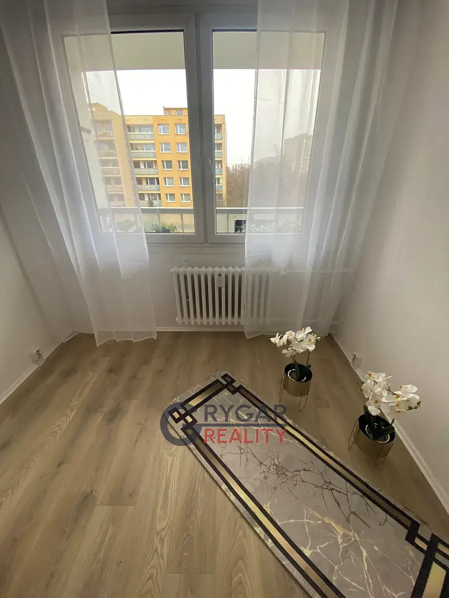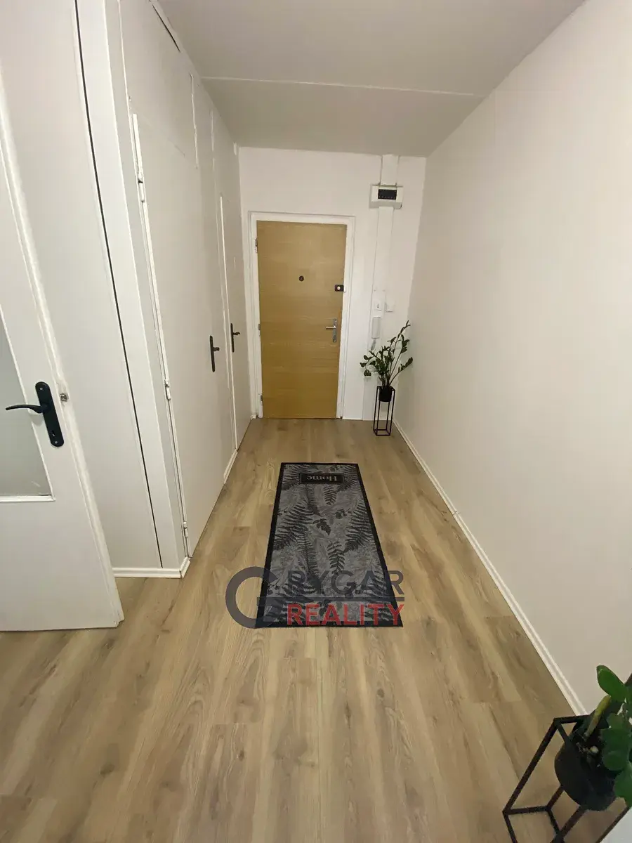 Námi nabízený byt 2+kk/L (45 m2 + velká lodžie 7 m2) v původním, ale udržovaném stavu se nachází v 3.NP/ z 10.NP, vedle bytu vlastní komora (1,22 m2), v přízemí domu vlastní sklepní kóje (1,40 m2). Dispozice bytu: vstupní chodba (6,37 m2) do tvaru "L", vpravo samost. WC (1 m2) a koupelna (2,16 m2) s přípojkou pro pračku. Naproti vchodu ložnice (12 m2) s oknem na lodžii. Vpravo vstupujeme do obývacího pokoje (15,45 m2), který je průchozí do kuchyně (5 m2), kde byla vyměněna kuchyňská linka za novou v bílém provedení. Z obývacího pokoje je vstup francouzskými dveřmi na lodžii (7 m2), která je přes oba pokoje a orientována na východ. V celém bytě plovoucí nové podlahy, topení dálkové ústřední.