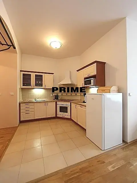 Dispozice bytu: vstupní předsíň, obývací pokoj s jídelní částí a plně vybaveným kuchyňským koutem se spotřebiči (sklokeramická varná deska, trouba, myčka a lednice s mrazákem plus rychlovarná konvice, toaster a nádobí), ložnice orientovaná do dvora a koupelna (se sprchovým koutem, umyvadlem, toaletou a pračkou se sušičkou).