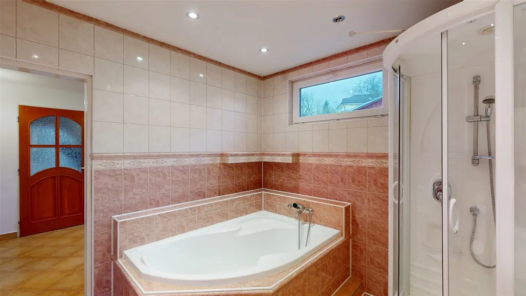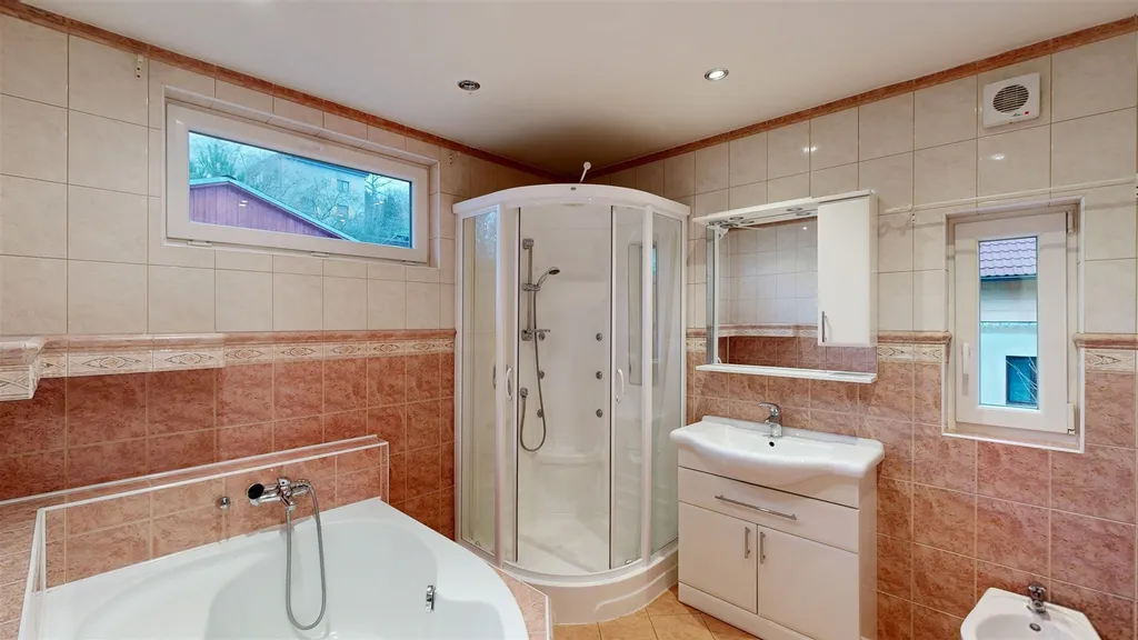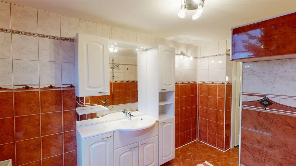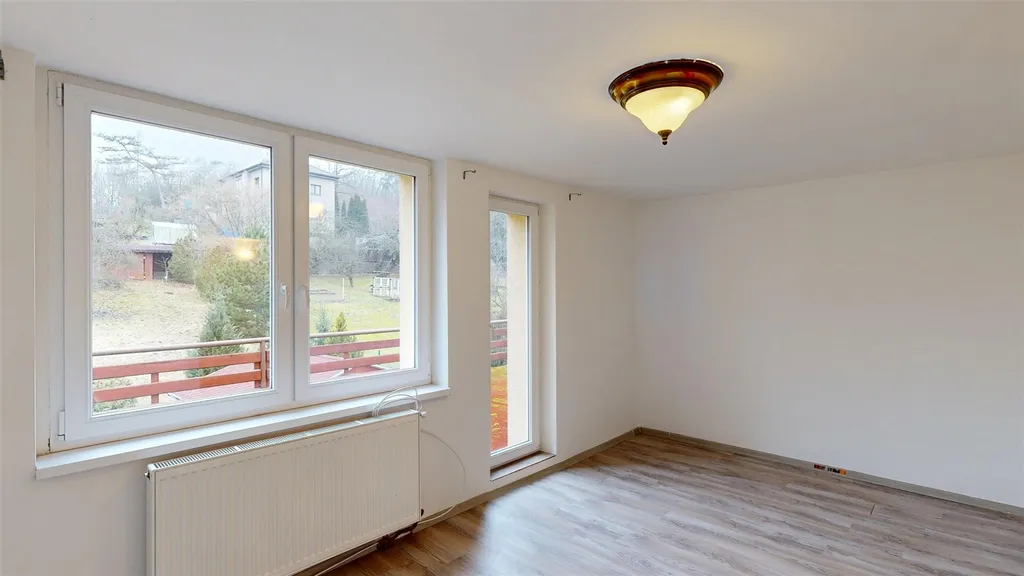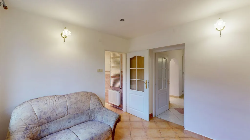 Dvě ložnice (z jedné vstup na prostornou terasu orientovanou do zahrady), velká koupelna a vstup na půdu.