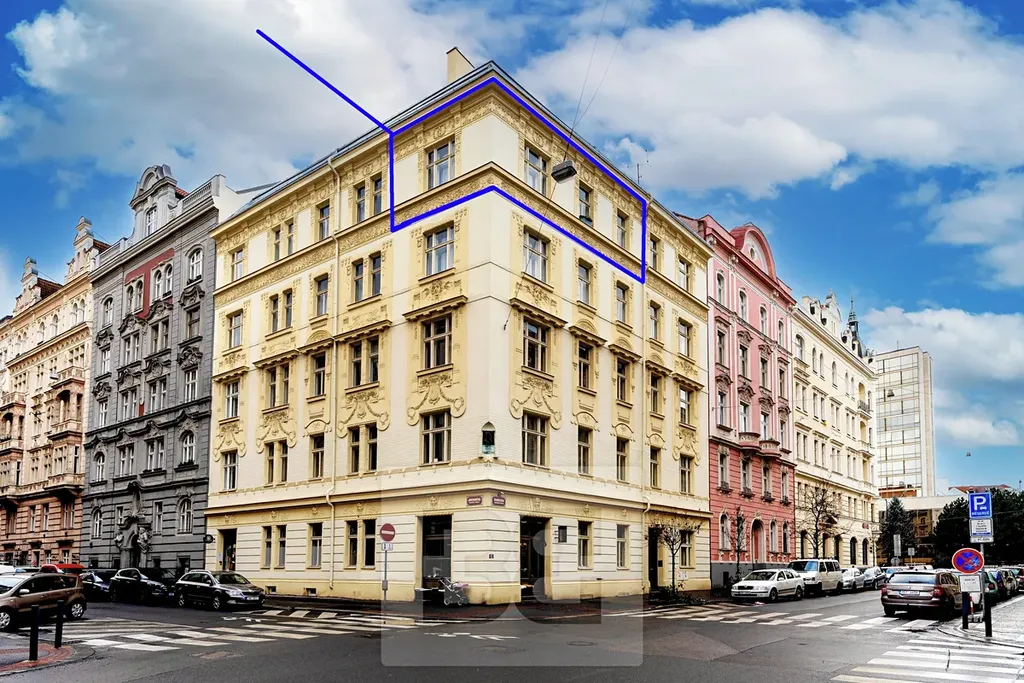 Z hlavního obytného prostoru se vstupuje do posledního pokoje situovaného v nároží budovy, odkud je nádherný výhled na historickou zástavbu Letné a okolní ulice.