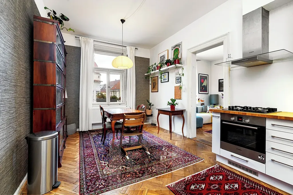 Byt působí velmi příjemně a vzdušně, a to i díky vyšší světlé výšce stropů. K bytu náleží sklepní kóje (2,2 m²).