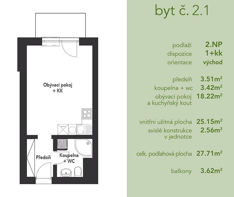 K dispozici budou byty 1+kk, o rozměrech 30m², s balkonem. Byt bude vybaven kuchyňskou linkou se spotřebiči (lednice, varná deska, digestoř a trouba).