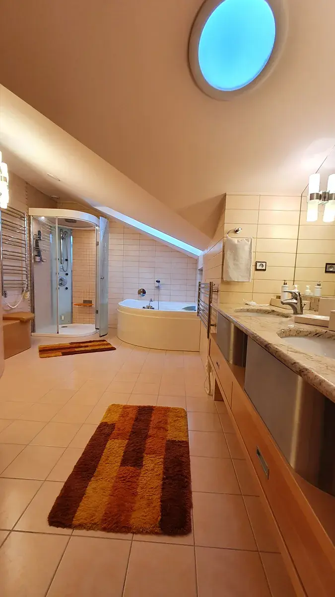 Garáž, kovové schodiště, pracovna, sklad, kotelna–tepelné čerpadlo, prádelna, předsíň, šatna, WC, dřevěné schodiště, hala, akvárium1400l., krb, sklad kuchyně, kuchyň se žulovými pracovními deskami (kuchyňska linka, el.varná deska indukce De Dietrich, digestoř, el. trouba De Dietrich, mikrovlnná trouba De Dietrich, parní trouba De Dietrich, dva dřezy, americká lednice), obývací pokoj s jídelnou se světelnémi rampy se stmivání světla, terasa, žulové schodiště, tělocvična, chodba, bazén ((s prosklenou stěnou do bowlingu) 60 m2 (90 m3), hloubka 1,50m, protiproud, skákadlo, chrlič, masážní proud, vzduchotechnika, automatické dávkování chemie, UV lampa), sprcha,