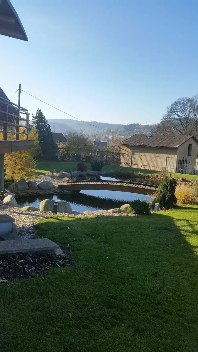 Na pozemku je osvětlený tenisový kurt s antukou a tenisovou stěnou a průhledným oplocením, dřevěný altán (100 m2, trvanlivé tvrdé dřevo bangkirai, svislé nosné konstrukce zděné, terasa s kuchyní s východem k jezeru, rozvody vody a elektroinstalace, krb, udírna, zatravněná střecha), místnost pro zahradní nářadí a zahradní nábytek, elektrorozvodna, WC, stavba technického zázemí a filtrace jezírek, jezírko malé o rozloze 20 m2 s filtrací a jezero střední velikosti 220 m2. s mostem a filtrací, venkovní úpravy (zpevněné plochy 300m2-betonová kostková dlažba Best, kovový plot, el. brány a dveře, garáž 84m2 (el.vrata). Zahrada je oplocená.