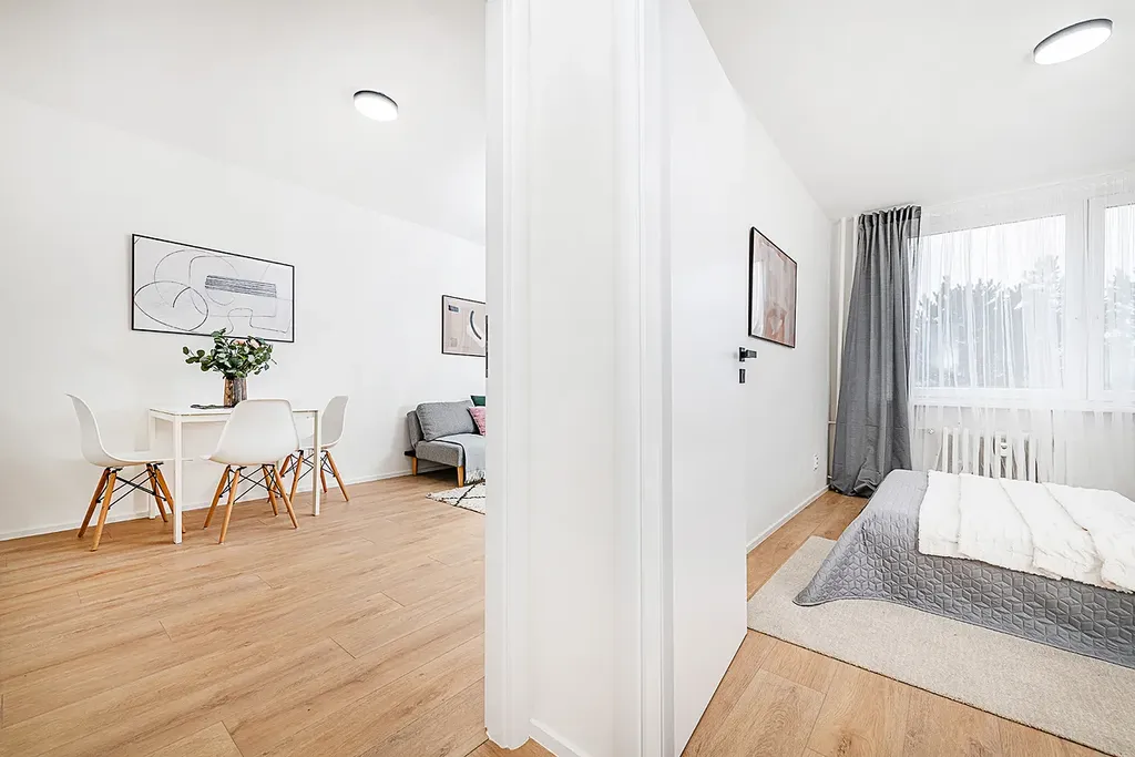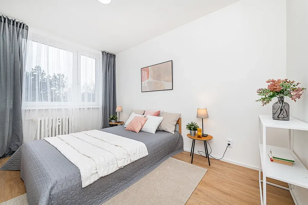 Dispozici bytu tvoří neprůchozí ložnice, velkorysý obývací pokoj spojený s kuchyní, prostorná koupelna se sprchovým koutem a samostatný záchod.