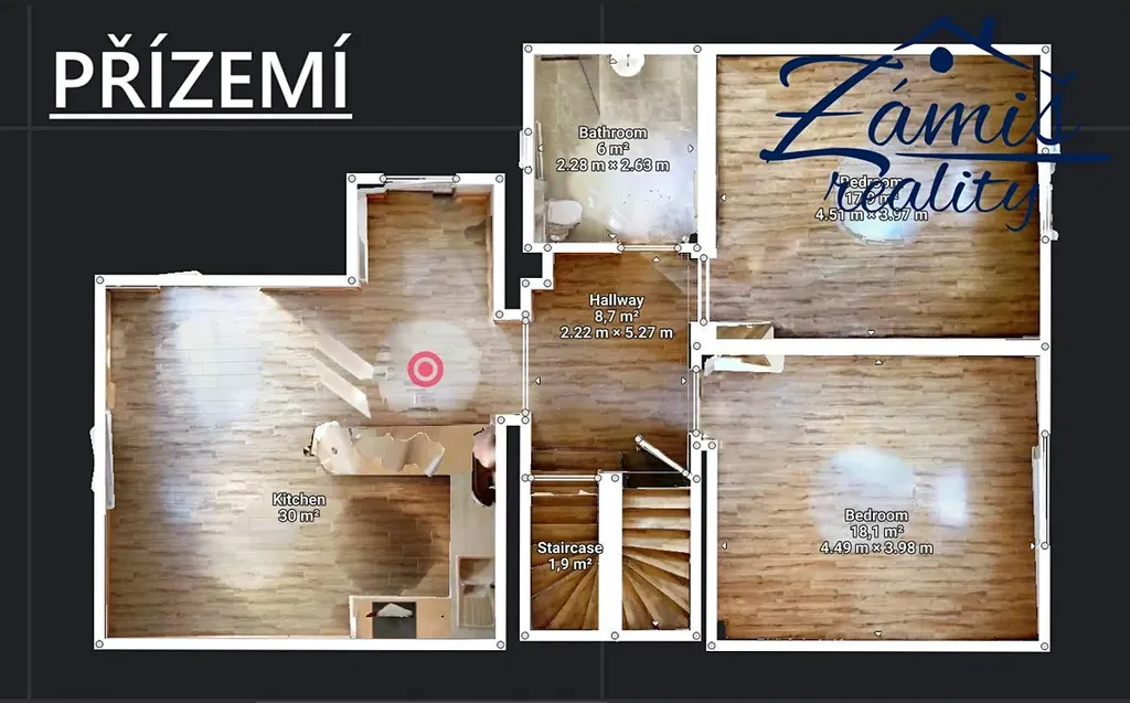 V kuchyni s jídelnou je položena keramická dlažba, stejně tak na chodbě, schodišti a v koupelnách. V pokojích je pak nová plovoucí podlaha.