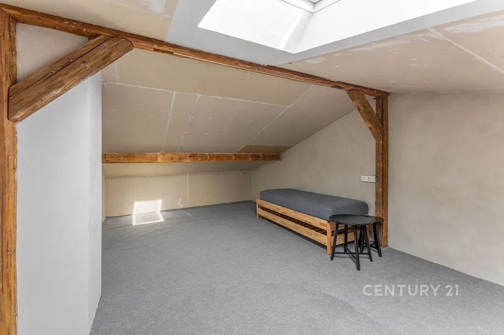 Podkroví je ve fázi přípravy na další obytný pokoj – nové střešní okno, rozvody elektřiny, topení, LED osvětlení, zateplená střecha a sádrokartonové podhledy. Pro plnohodnotné využití je vhodné dodělat zateplení bočních stěn od sousedních jednotek.