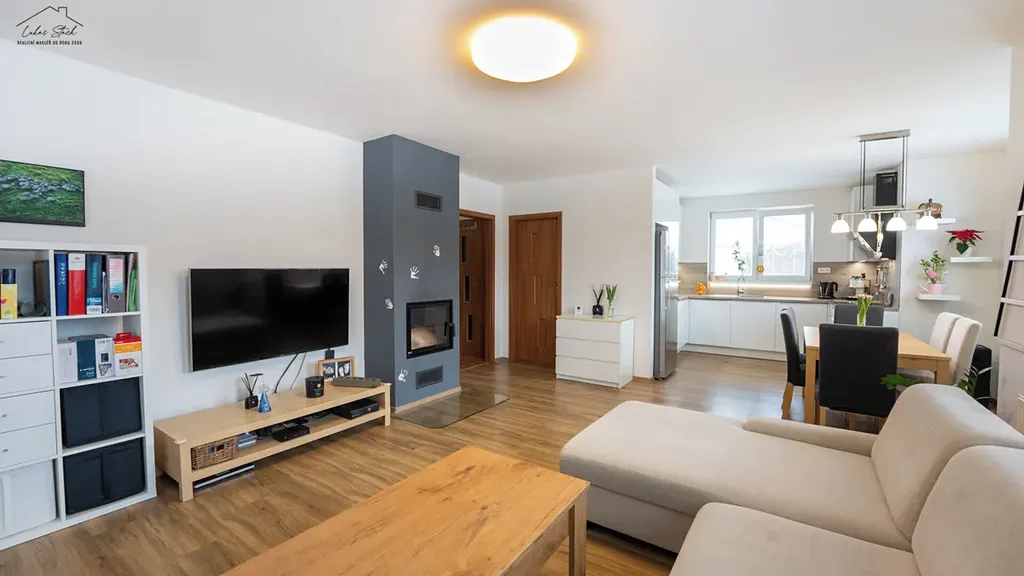 Srdcem domu je obývací pokoj s krbem a kuchyňským koutem o velikosti 26 m². Právě tady se odehrává běžný rodinný život. Společné večeře, víkendové snídaně, návštěvy přátel i klidné večery u ohně.