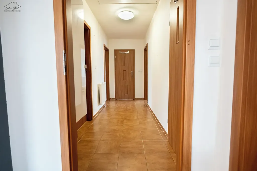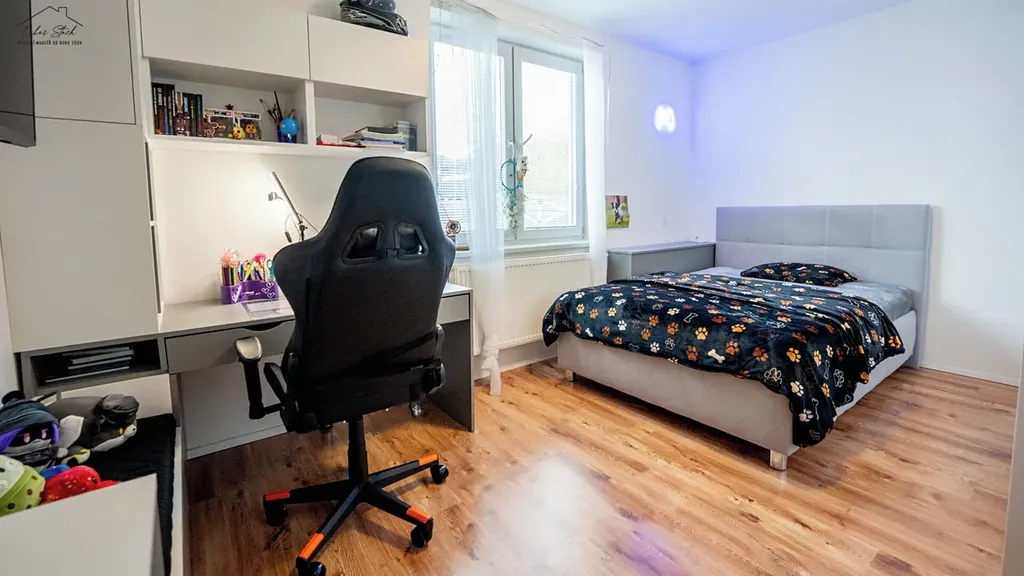 Dva pokoje mají téměř 14 m², takže nejde o žádné malé místnosti, ale o plnohodnotné dětské pokoje nebo ložnici. Třetí pokoj o velikosti 11 m² může sloužit jako pracovna, pokoj pro hosty nebo menší dětský pokoj.