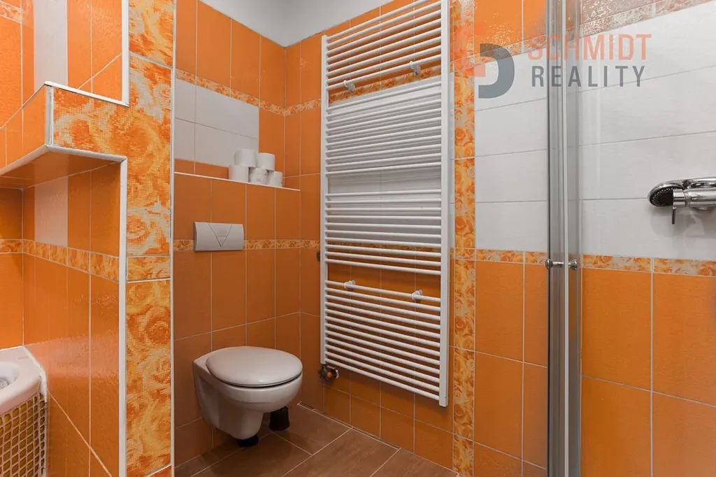 V koupelně najdete vanu i sprchový kout a toaletu.