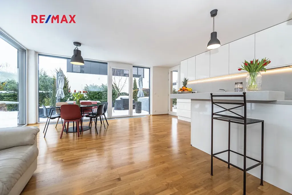 Součástí obývacího pokoje je kompletně vybavená kuchyňská linka (Livanza) s kvalitními spotřebiči (Siemens/ Bosh) a s praktickým ostrůvkem, prostor je krásně světlý a slunný celý den.