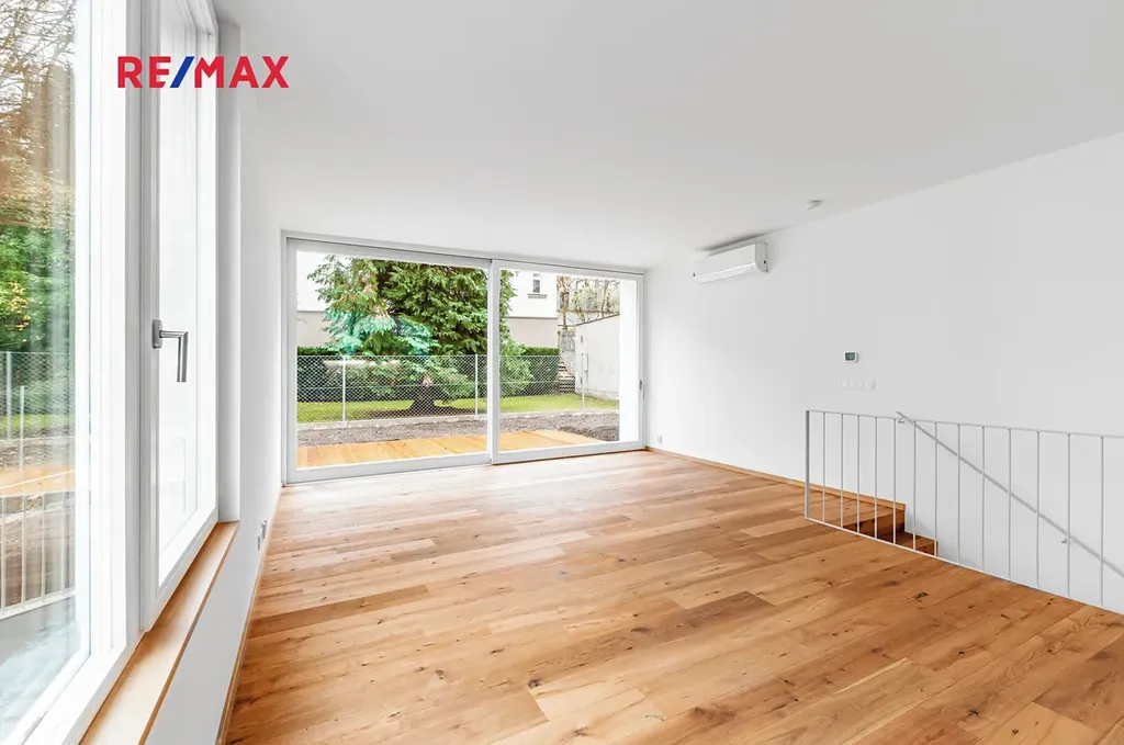a samozřejmostí je i klimatizace. Byt se nachází v prvním a druhém nadzemním podlaží. Z prostorné vstupní haly (7 m2) doplněné menší komorou a vestavnou skříní se vchází do chodby odkud jsou přístupné tři místnosti, dvě ložnice (každá 10 m2) a pracovna či další ložnice pro hosty (7 m2). Z jedné z těchto ložnic je i přímý výstup na spodní část pozemku, která se užívá pouze s tímto bytem. V tomto podlaží je k dispozici ještě koupelna s vanou a WC a také samostatné WC s umyvadlem. Z chodby vystoupáte po dřevěném schodišti do velkorysého obývacího pokoje o velikosti 42 m2 s kuchyňskou linkou. Ta je vybavena lednicí s mrazákem, myčkou, dřezem, varnou deskou a elektrickou troubou. Odvětrání je zajištěno pomocí digestoře. Z obývacího pokoje za kuchyní pak vejdete do ložnice rodičů (13,6 m2), která je doplněna vlastní koupelnou se sprchovým koutem a WC. Více v přiložených půdorysech. Dominantou obývacího pokoje je velká prosklená stěna, na kterou navazuje zpevněná dřevěná terasa (15 m2) s jižní orientací. Okolo východní a jižní strany bytu se nachází dvouúrovňová předzahrádka spojená schodištěm. U vstupu do bytu pak jsou k dispozici 2 parkovací stání, která je možno si pronajmout spolu s bytem - obě za 3.000,- Kč měsíčně.