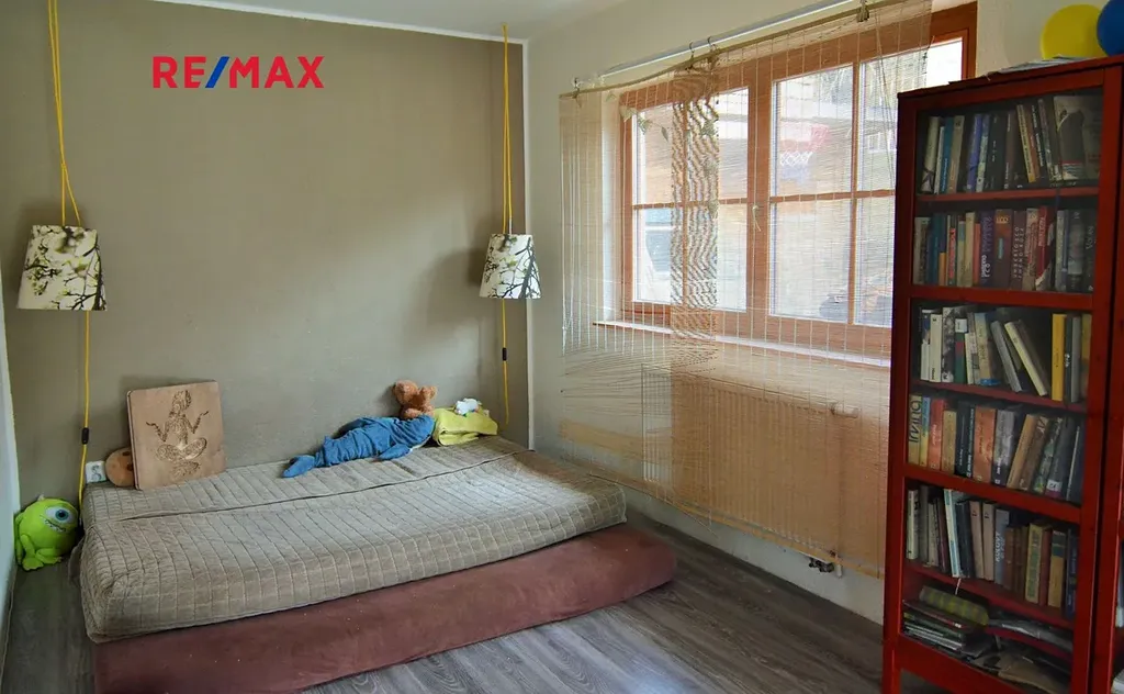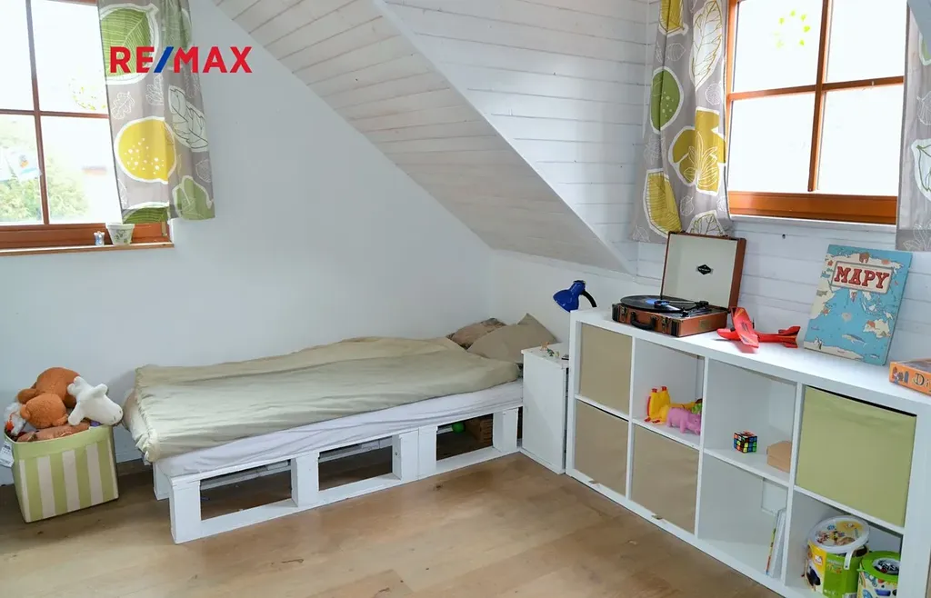 Dispozice 5+kk vznikla rozdělením většího pokoje kvůli dětem – jednoduchým odstraněním příčky lze získat velkorysé 4+kk se dvěma prostornými ložnicemi v patře.