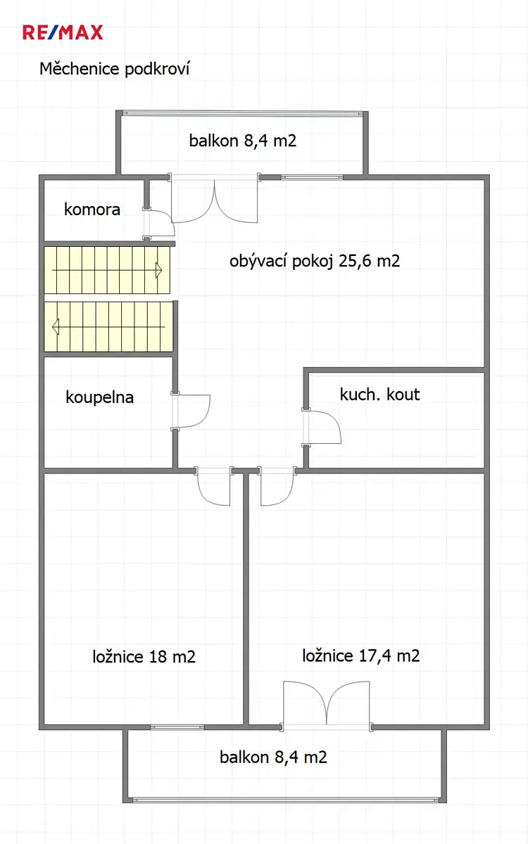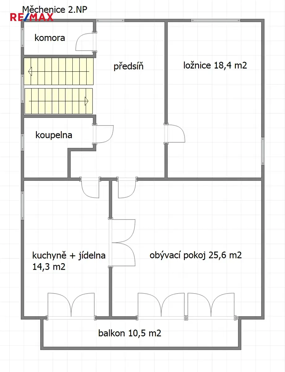 Ve 2. patře se nachází druhá bytová jednotka o dispozici 2+1 a rozloze 89,3 m². K dispozici je nová kuchyňská linka vč. kvalitních spotřebičů a koupelna s vanou a oknem, tj. obytná plocha 78,8 m² + zasklený balkon o rozloze 10,5 m² + prostorná zimní zahrada. Balkon se díky celoprosklené konstrukci a zasklení zrcadlovými skly stává ideálním místem pro odpočinek po celý rok. Druhá zimní zahrada poskytuje přímý vstup na zahradu.