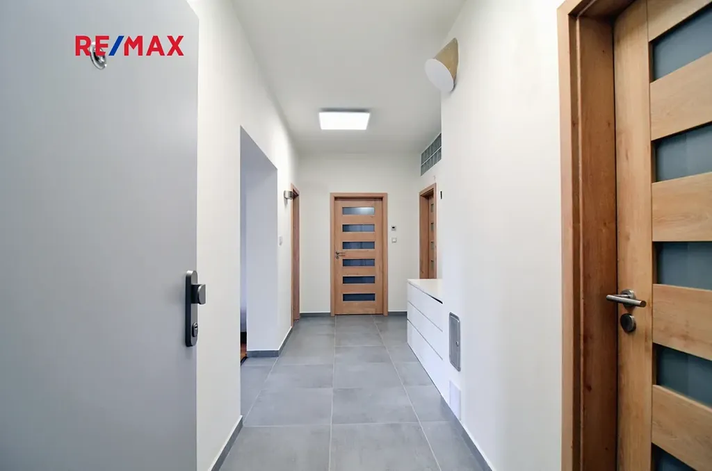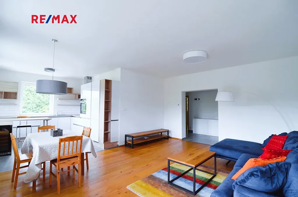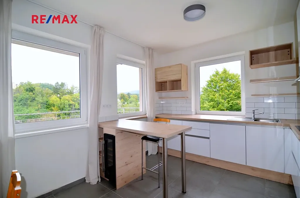 Byt se skládá ze světlého obývacího pokoje (38,4 m2) s kuchyňským koutem s mnoha okny na dvě světové strany a s výstupem na balkón o velikosti 11,5 m2. Dále z opravdu prostorné ložnice o velikosti 25,8 m2, s výstupem na druhý balkón o velikosti 5 m2. Tento pokoj lze v případě potřeby snadno přestavět vybudováním jedné příčky a přidáním dveří a vzniknou tak např. dva dětské pokoje (viz přiložené půdorysy bytu) Dále je v bytě další pokoj (17,1 m2). Ložnice jsou orientované na východ, směrem do zeleného zalesněného svahu, což poskytuje v této části bytu klid na spaní a v létě příjemný chládek. Prostorná světlá koupelna (8,1 m2) s přímým denním osvětlením je vybavena vanou, umyvadlem s koupelnovou skříňkou, WC ale také sprchovým koutem. V technické místnosti (6,4 m2) je další WC s umyvadlem a bidetovou sprškou a také elektrický bojler, pračka a sušička. Z prostorné vstupní haly je vstup do všech místností v bytě. Je zde i možnost připojení krbu nebo krbových kamen. Samotný vstup do bytu je jištěn bezpečnostními dveřmi. Na podlahách je kvalitní dřevěná podlaha z masivu a velkoformátová dlažba, v koupelně pak působivá dlažba v patchwork designu. Dveře v bytě jsou dřevěné, částečně prosklené v obložkových zárubních. Okna jsou bílá, plastová.