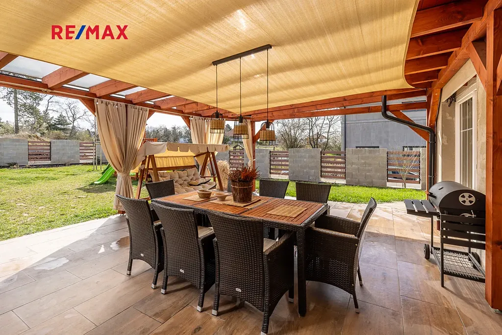 Součástí domu je také velká a zastřešená terasa, ideální pro relaxaci či posezení s přáteli – slunce si zde užijete od rána až do večera.